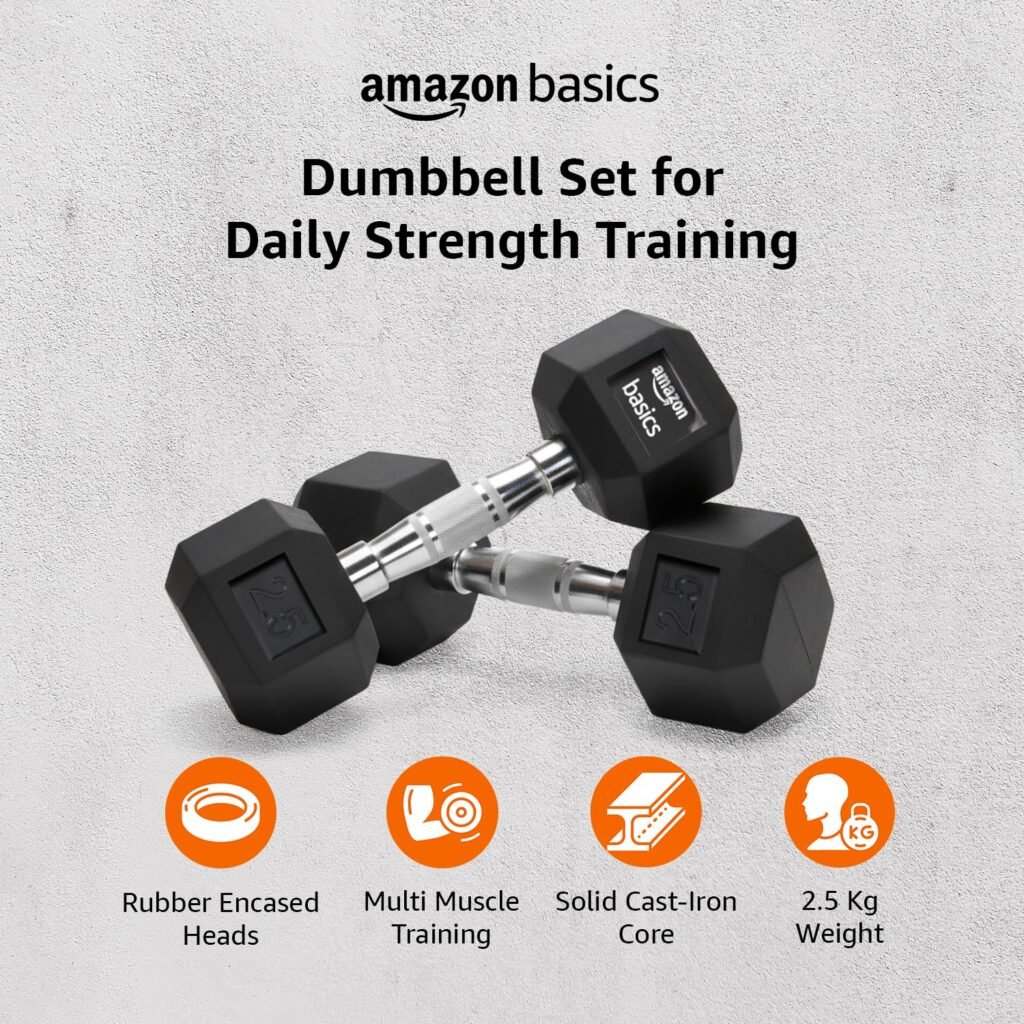- 1.Amazon basics Rubber Encased Hex Dumbbell Weight Set Of 2, 2.5 Kg, Black