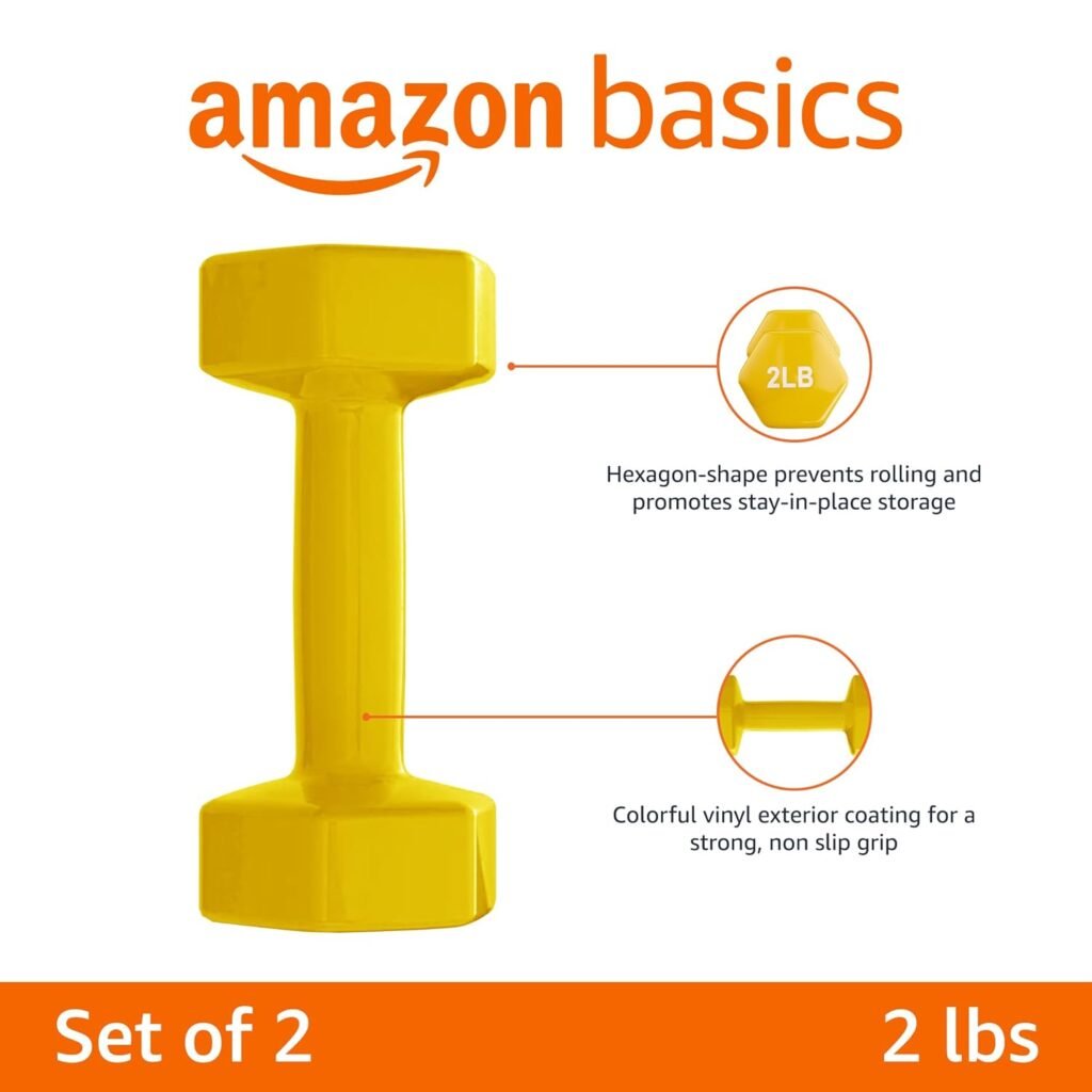 - 5.Amazon basics Vinyl Coated Dumbbells | Set of 2 | 2 Pounds Each | Cast Iron Dumbbells | Yellow