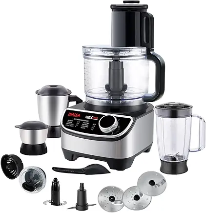 INALSA INOX 1200 Food Processor is a powerful all in one kitchen appliance designed for heavy-duty food preparation. Equipped with a 1200 W 100% copper motor, it efficiently handles tasks like chopping, kneading, grinding, blending, juicing, shredding, and slicing. The large 2.5 L processing bowl and three jars make it suitable for families and bulk cooking. It includes both centrifugal and citrus juicer attachments, along with stainless-steel blades and discs for versatile use. With multiple speed settings and a pulse function, this food processor offers control and convenience for everyday Indian cooking needs. Many parts are easy to clean and dishwasher safe.