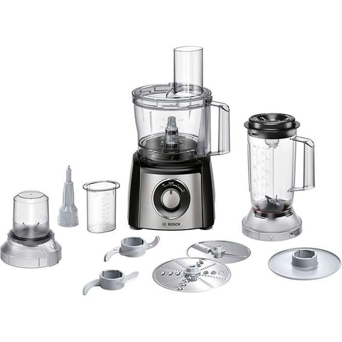 The Bosch MCM3501M 800 Watts Food Processor is a powerful and versatile kitchen appliance ideal for everyday cooking tasks. It’s driven by an 800 W motor with two speed settings and a pulse function, giving you control and power for a wide range of preparations. The processor includes a 2.3 L transparent bowl, MultiLevel6 knife, reversible shredding and slicing discs, dough blade, whisking attachments, and more, enabling you to chop, slice, grate, grind, knead, mix, and blend with ease. Accessories are dishwasher safe, and the SmartStorage system lets you store all parts neatly inside the bowl. This model combines German engineering quality with practical performance for medium family kitchens